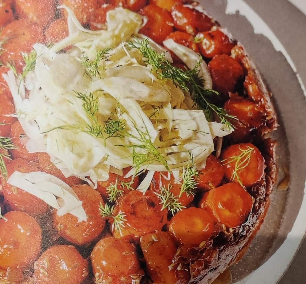 Een feestelijke, omgekeerde taart van stukjes wortel, geglaceerd met sherryazijnkaramel op en gebakken mengsel van zoete sjalotjes, knapperig venkelzaad en pittige gedroogde chilivlokken. In plaats van en traditioneel deeg wordt hier een soort veganistisch sconedeeg gebruikt, dat je in een paar minuten kunt maken en niet in de koelkast hoeft te zetten of te laten rusten. Je kunt ook kant-en-klaar of zelfgemaakt korstdeeg of zelfs pizzadeeg gebruiken.